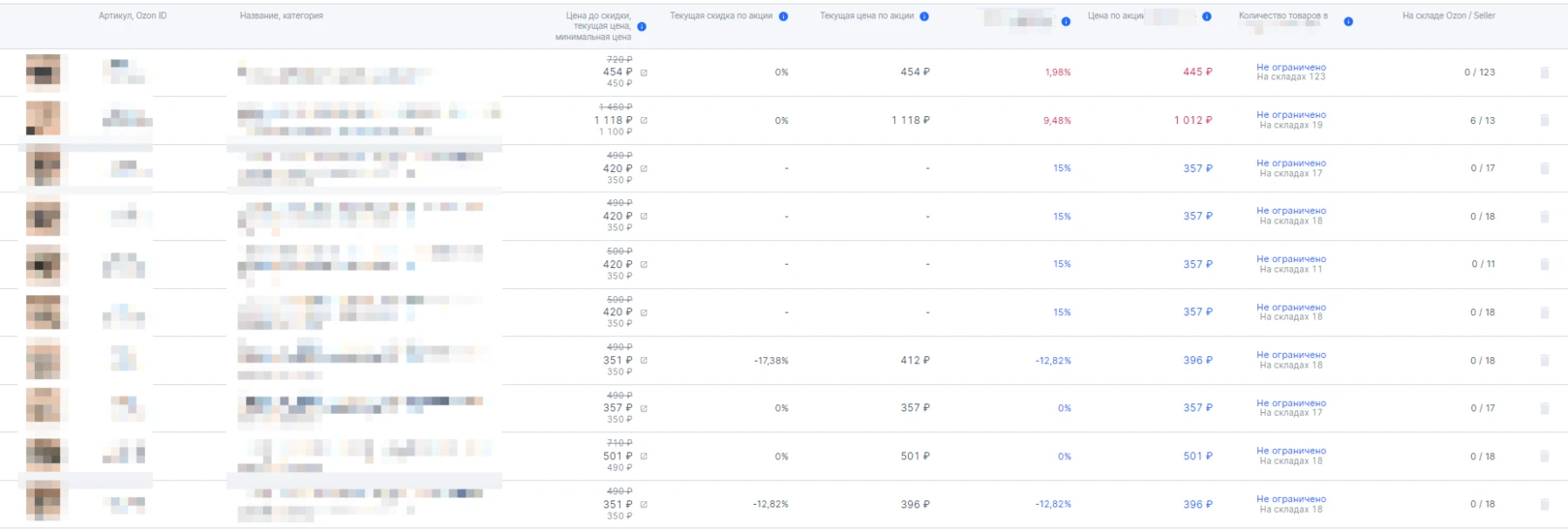 В самой акции менеджер теперь наглядно видит, что товары, которые OZON планирует добавить в акции и установить на них цену ниже минимальной – подсвечиваются красным. Их необходимо удалить. А товары которые имеют допустимую цену – подсвечиваются синим.