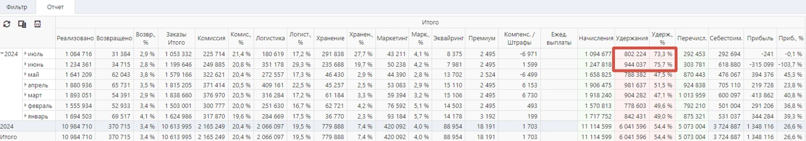 В режиме реального времени зашли с селлером в финансовый отчет «Начисления и списания» и увидели следующие отклонения за последние месяцы: резкое увеличение стоимости логистики и хранения товара. Как следствие доля удержания OZON от оборота составила более 70% от суммы выполненных заказов.