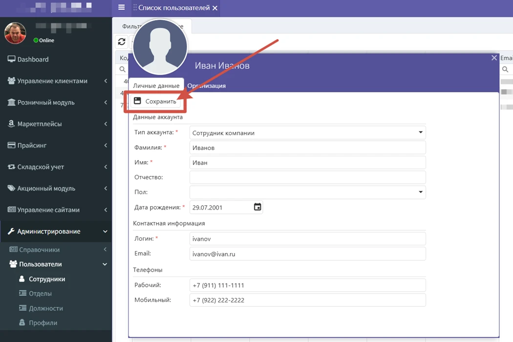 4. На вкладке "Профили" необходимо указать права сотрудника и нажать кнопку "Сохранить".