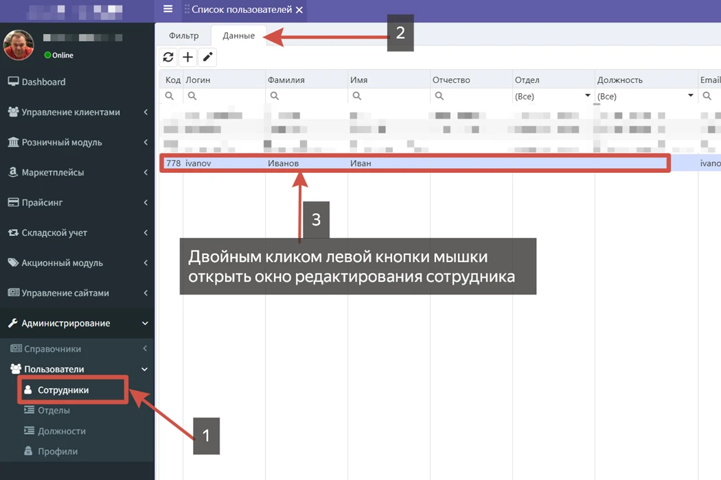 Переходим в раздел Администрирование --> Пользователи --> Сотрудники --> Данные --> Двойным кликом левой кнопки мышки открываем окно редактирования нужного сотрудника.