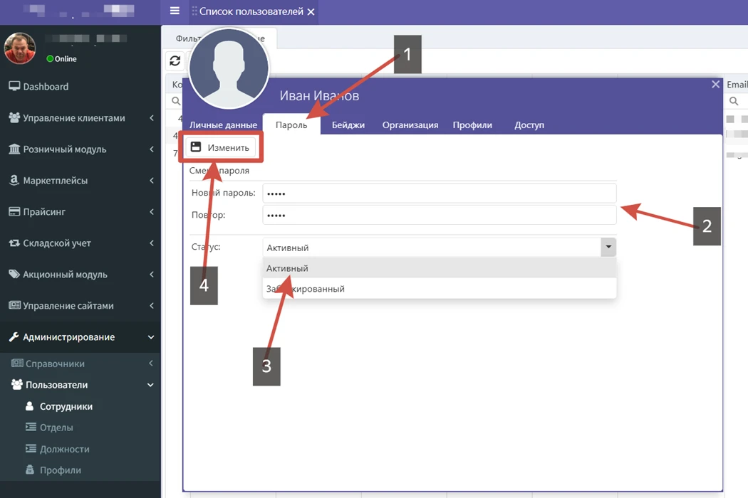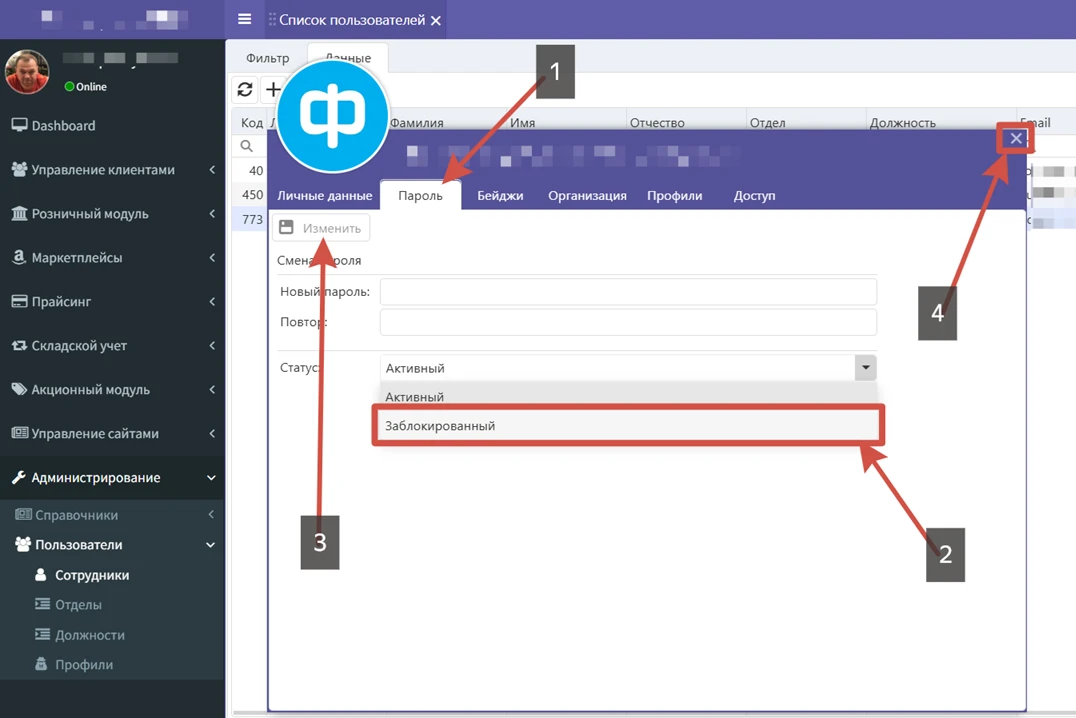 В окне редактирования сотрудника перейти во вкладку "Пароль", изменить статус с "Активный" на "Заблокированный" и нажать кнопку "Сохранить".