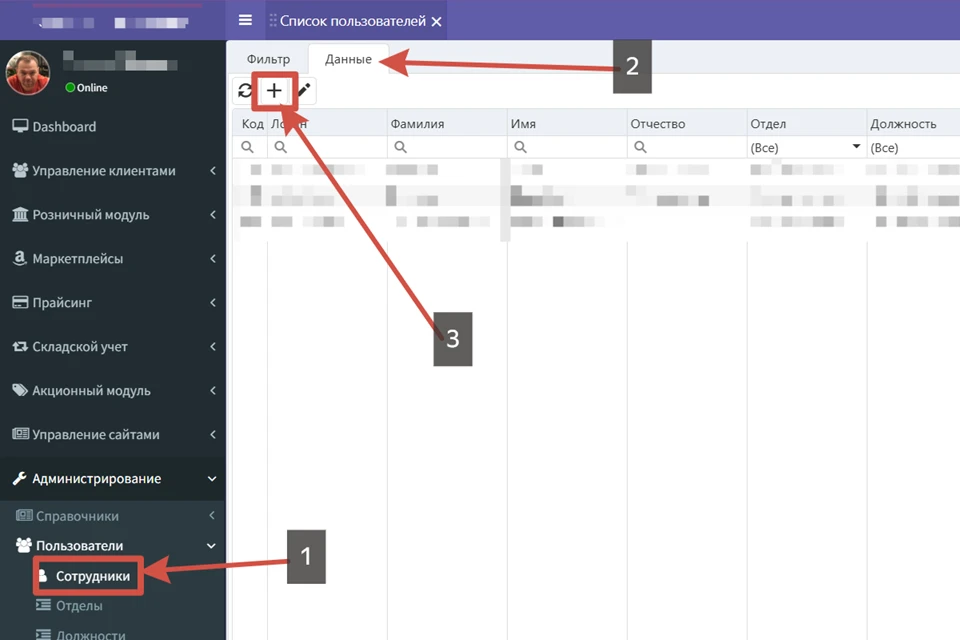 1. Переходим в раздел Администрирование --> Пользователи --> Сотрудники --> Данные --> Добавить нового: