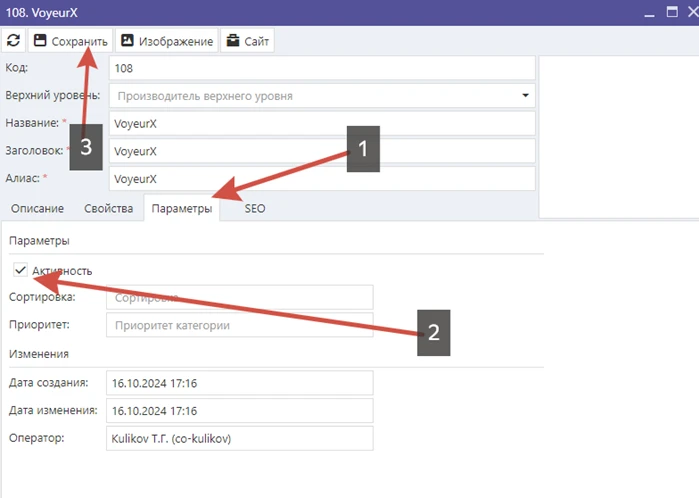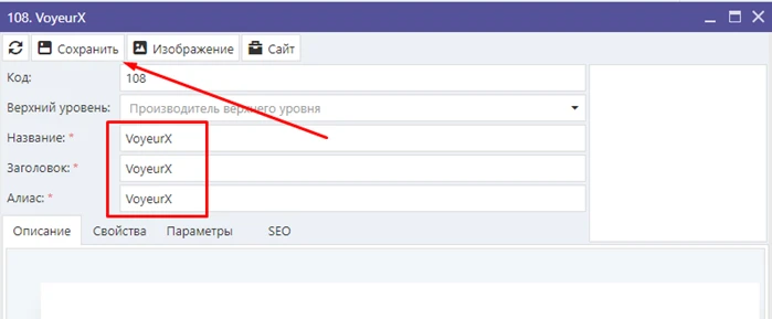 После нажатия кнопки «Сохранить» появятся дополнительные вкладки. Вам необходимо перейти во вкладку «Параметры», поставить «галочку», что производитель активен и сохранить еще раз: