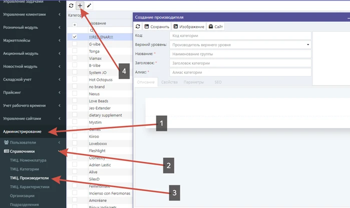 Путь: Администрирование --> Справочники --> Производители --> Добавить нового