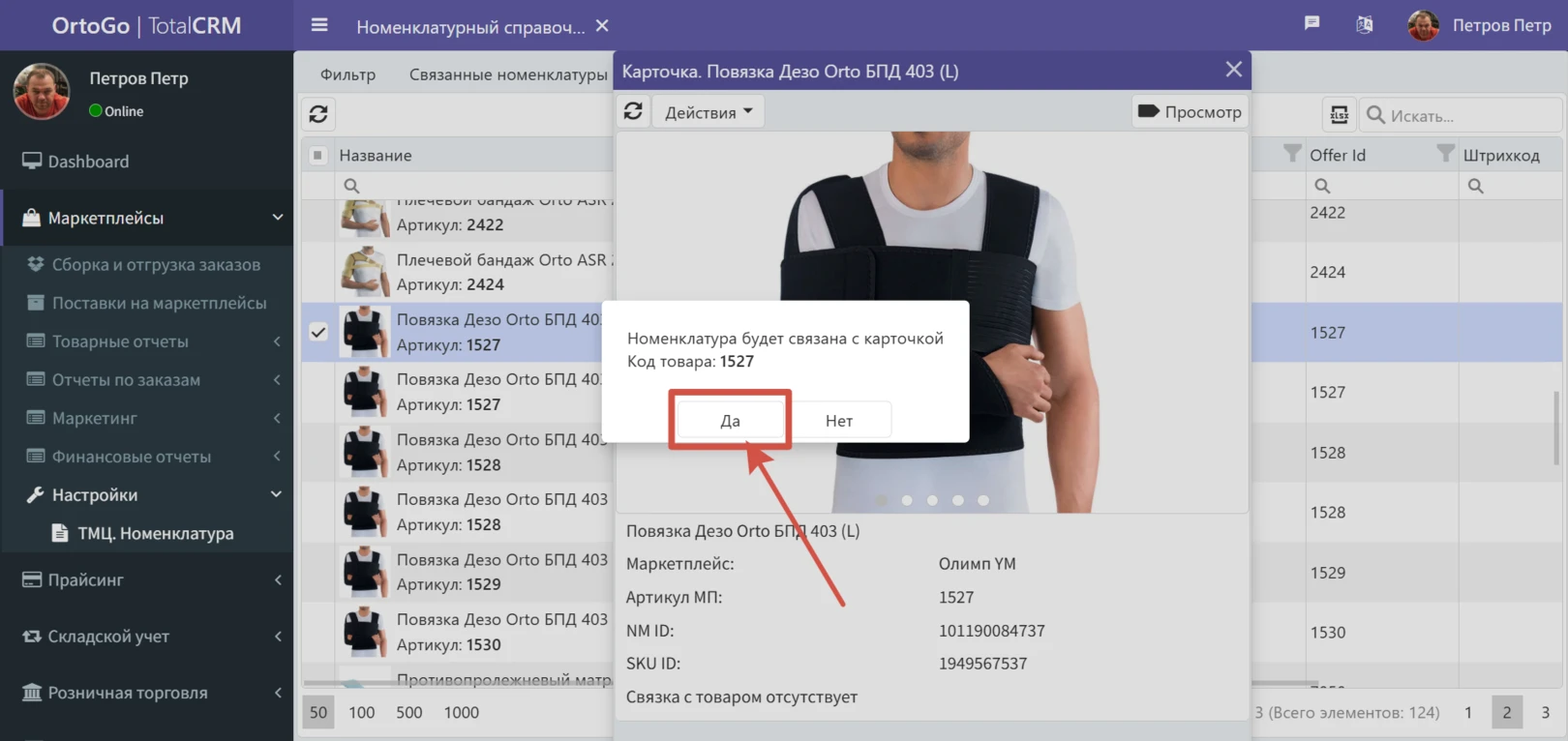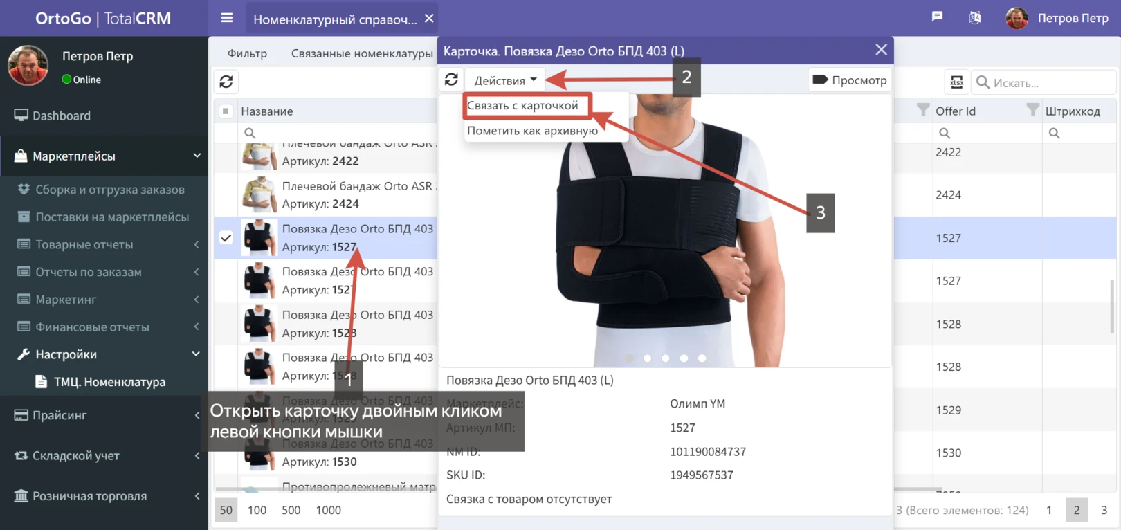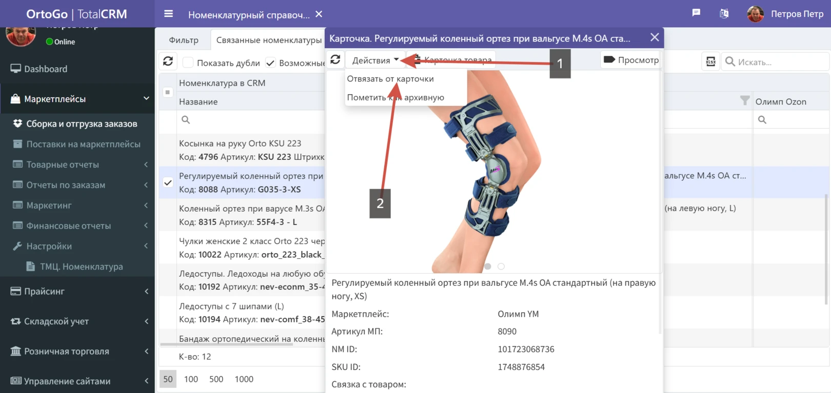 В TotalCRM ведется свой справочник номенклатуры, обычно он идентичен справочнику номенклатуры из системы учета селлера. Карточки товара из всех кабинетов маркетплейсов "цепляются" к единой карточке товара в TotalCRM.