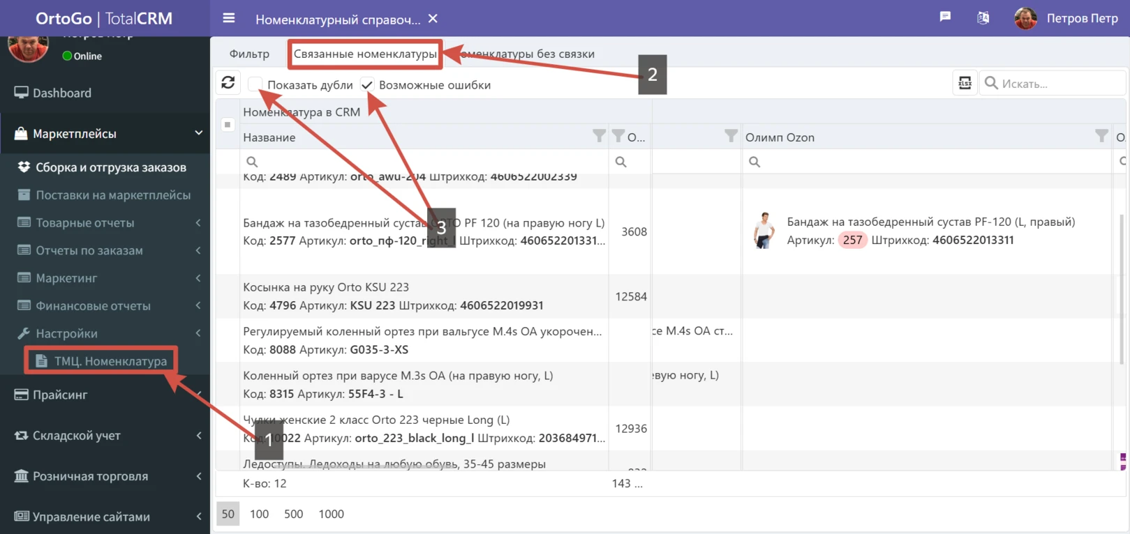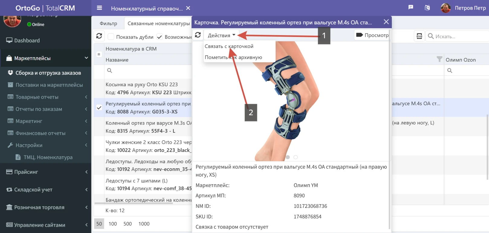 Когда в справочнике номенклатуры TotalCRM и кабинетов маркетплейсов нет совпадающих штрих-кодов или артикулов, появляется возможность ручного объединения карточек товара.
