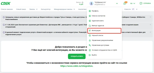 4. Перейти в раздел "Интеграции" и на нажать кнопку "Создать ключ":