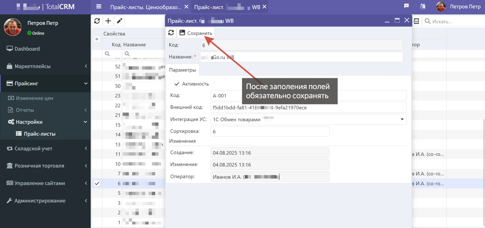- Внешний код. В это поле вписывается внешний код конкретного прайс-листа который поступает в TotalCRM через интеграцию с системой учета селлера.