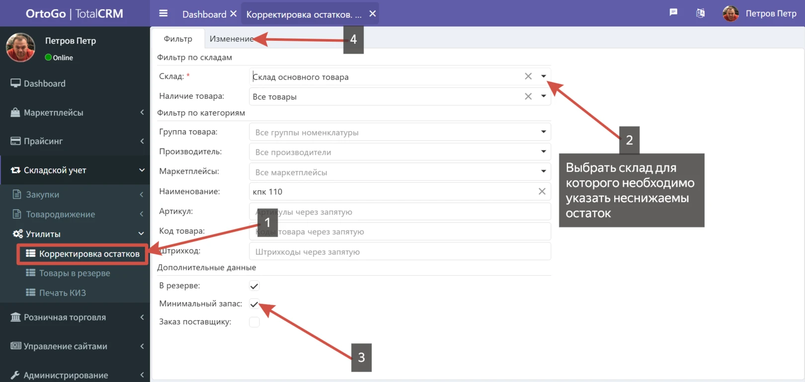 Для настройки неснижаемого остатка по товарам на складах необходимо: