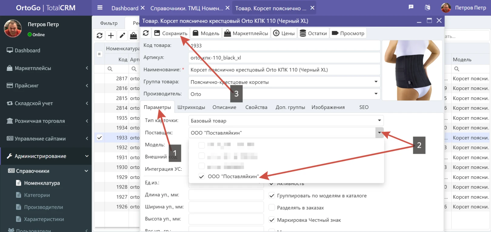 В открывшемся окне редактирования карточки товара, на вкладке "Параметры" выбрать поставщика и сохранить:
