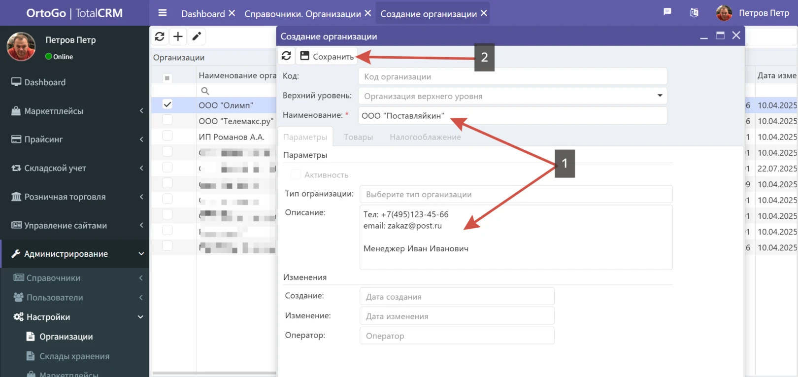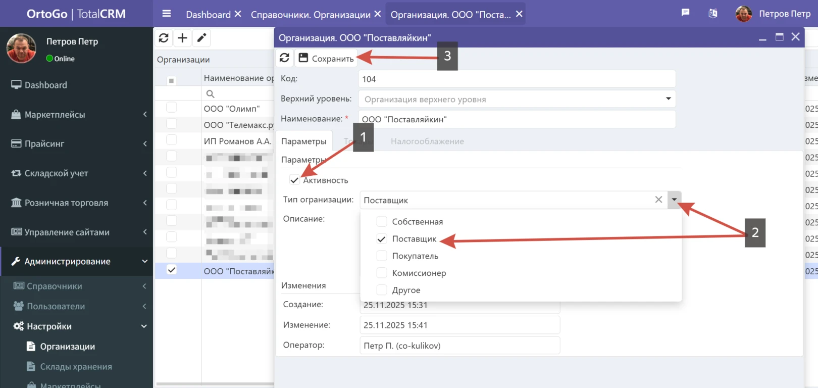 После сохранения поставщика появится активность у всех полей. Необходимо поставить чек-поинт у "Активности", указать тип организации "Поставщик" и сохранить: