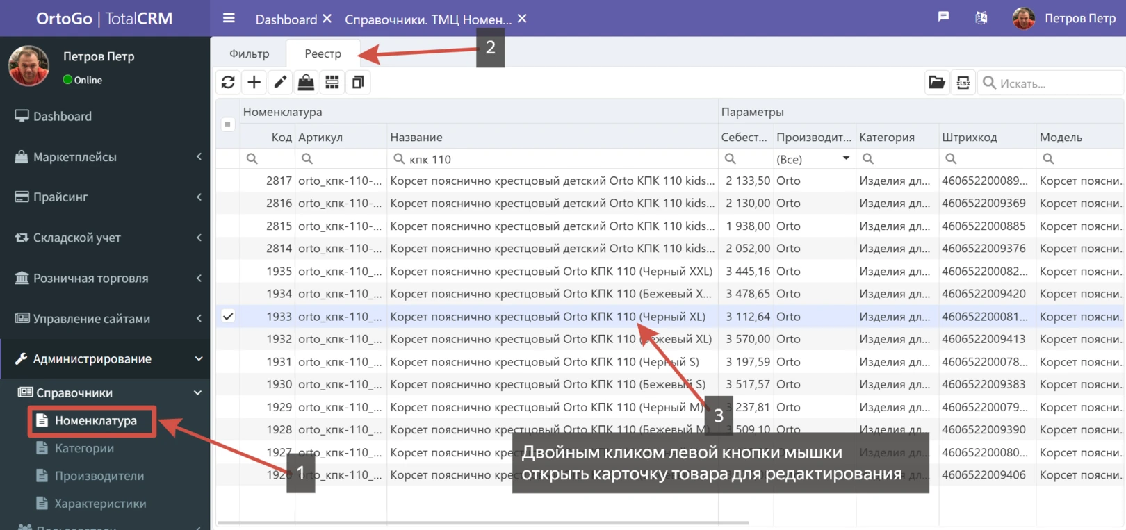 Редактирования карточки товара доступно из нескольких мест. Типовой путь к редактированию карточки товара: Администрирование --> Справочники --> Номенклатура --> Реестр --> Найти нужный товар и открыть карточку двойным кликом левой кнопки мышки: