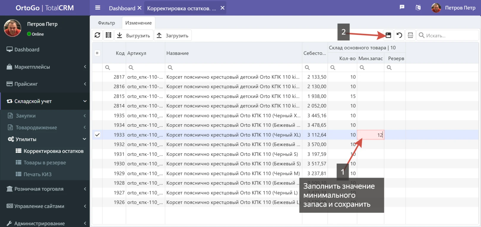 С спике товаров найти нужный и заполнить данные значение минимального запаса: