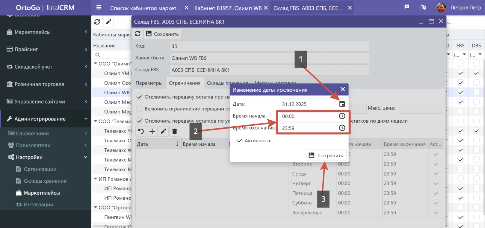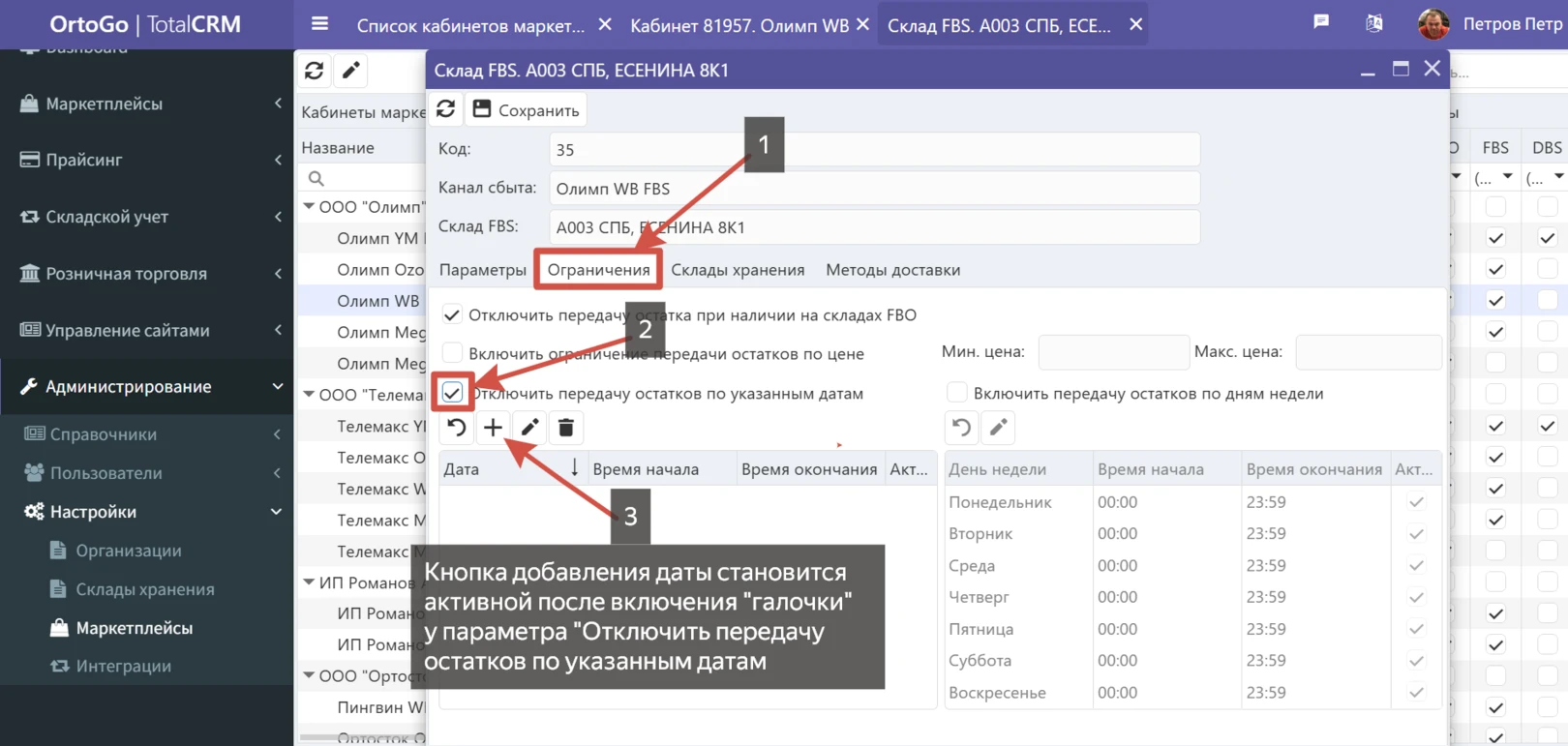 TotalCRM: Как включать ограничения по датам на передачу остатка с FBS складов