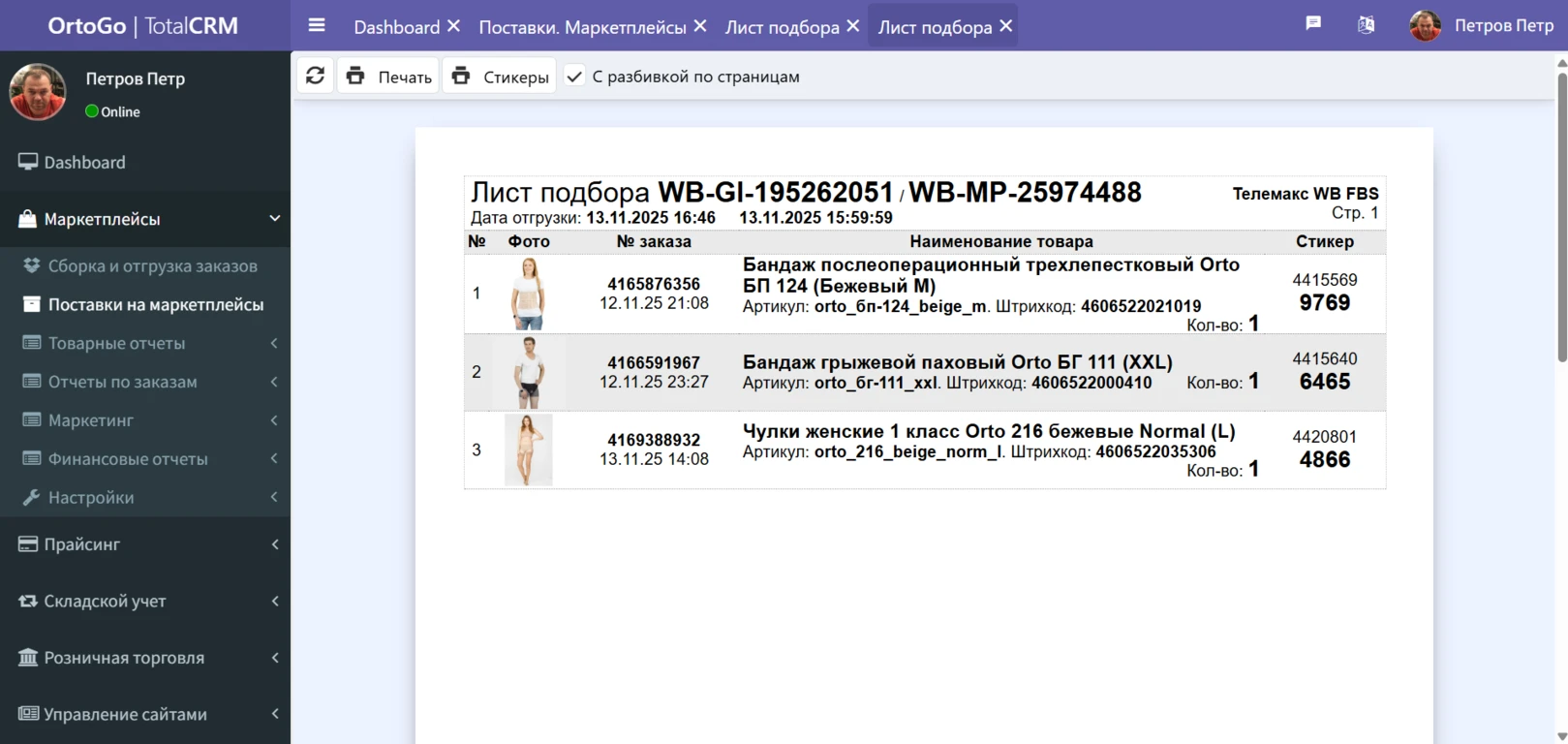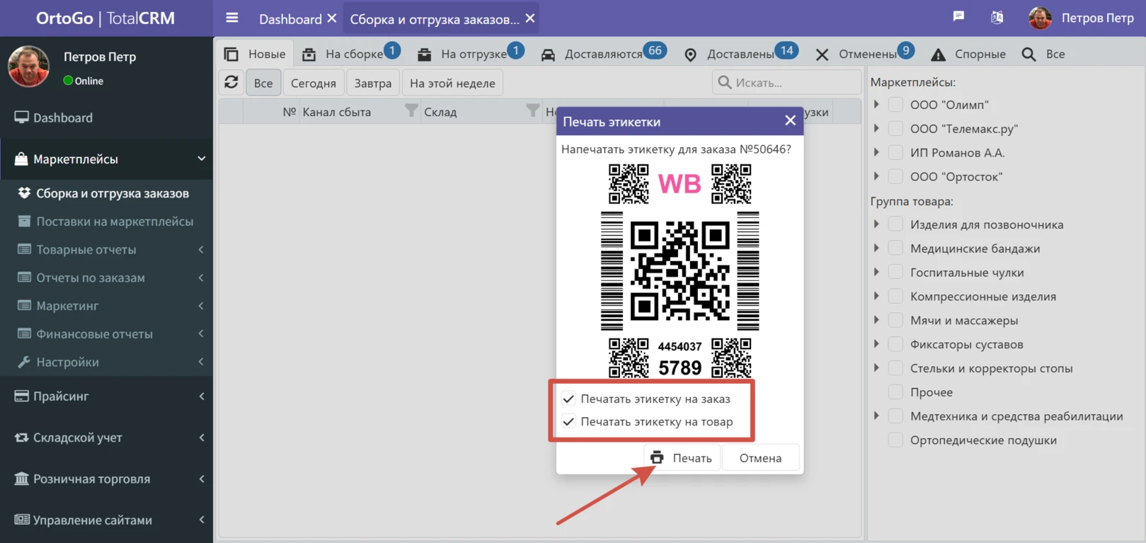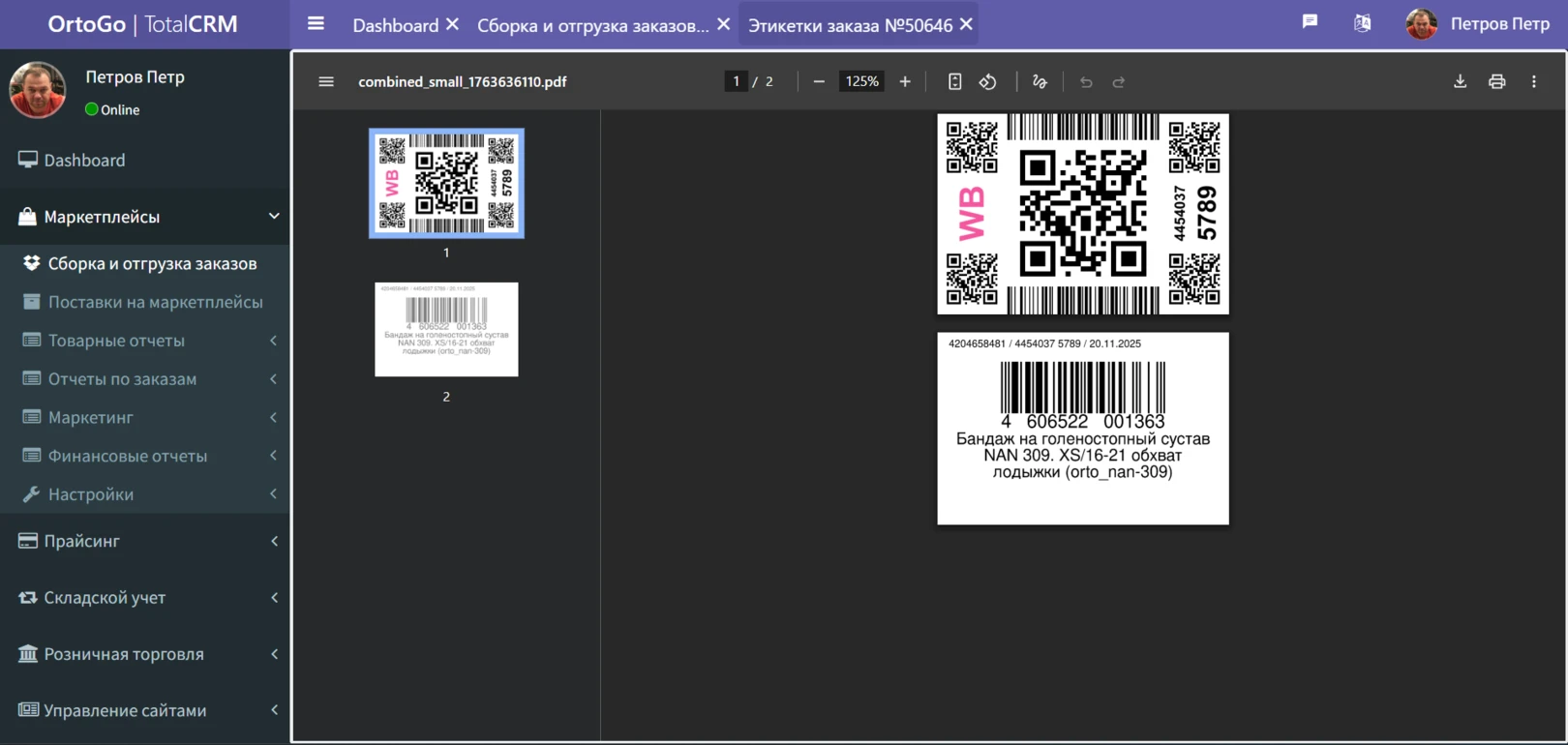 После того как TotalCRM получает наклейку с данными по заказу из кабинета маркетплейса, у сотрудника открывается всплывающее окно где предлагается распечатать наклейку с данными по заказу, а также наклейку с данными по товару: