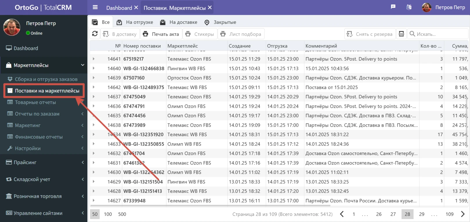 Путь к поставкам: Маркетплейсы --> Поставки на маркетплейсы: