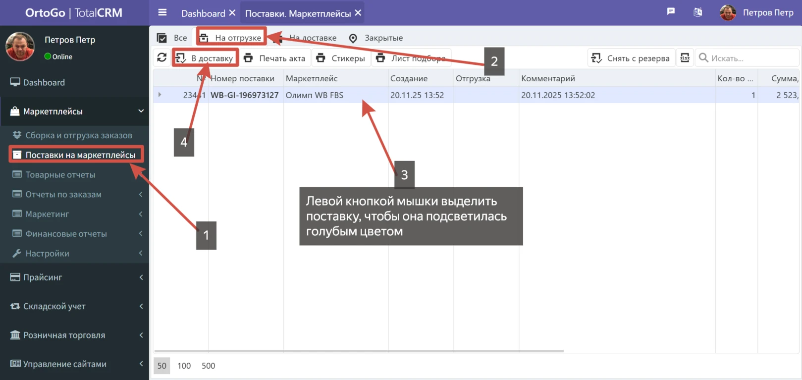 При переводе заказа в статус "На отгрузке" через интерфейс TotalCRM, автоматически создается поставка. На каждый маркетплейс или тип доставки создается уникальная поставка. Все последующие обработанные заказы добавляются в уже открытые поставки, автоматически.