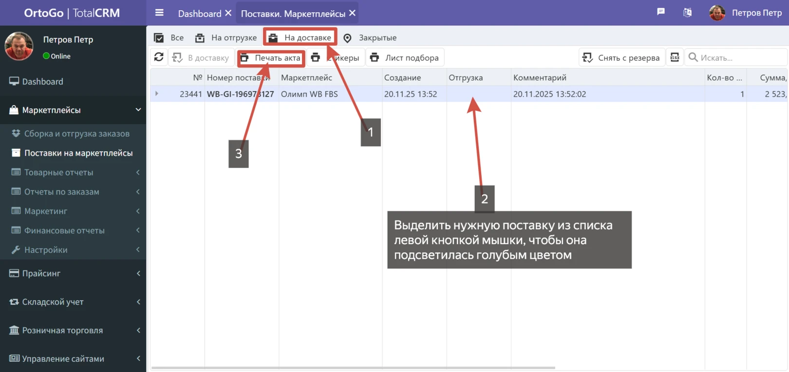 Когда все заказы обработаны необходимо закрыть поставку и сформировать акты передачи. Для этого необходимо в разделе "Поставки на маркетплейсы" открыть вкладку "Новые", левой кнопкой мышки выделить поставку и нажать кнопку "В доставку". Произойдет закрытие поставки. В закрытую поставку невозможно добавить новые заказы.