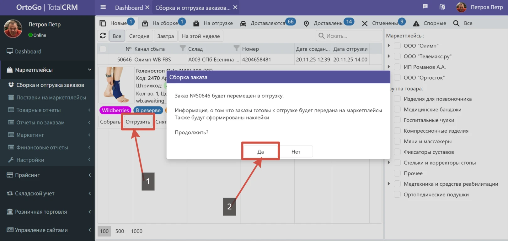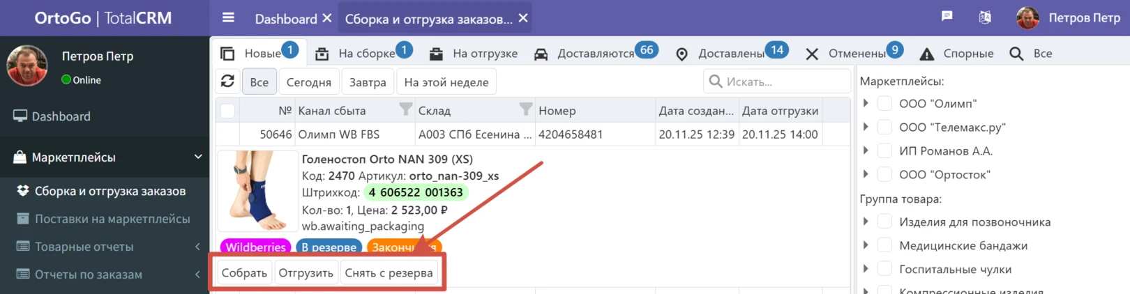 - На сборке: Внутренний статус, позволяет обработать заказ в TotalCRM, но не передавать информацию в кабинет маркетплейса