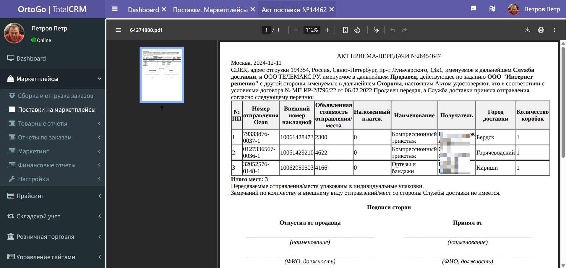 После того как поставка закроется, она автоматически переместится на вкладку "На доставке". Появится активность у кнопки "Печать актов" при нажатии на которую будут открываться печатные формы актов передачи.