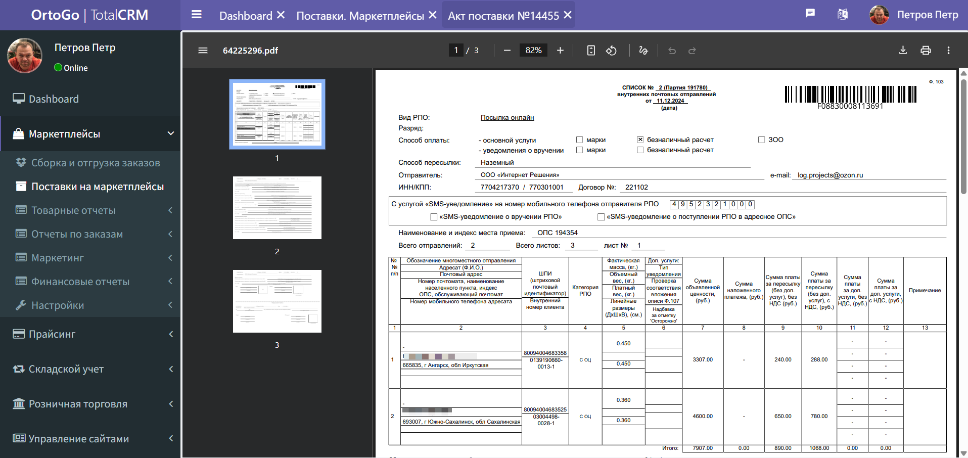 В TotalCRM разработано рабочее место обработки заказов. Заказы со всех подключенных кабинетов маркетплейсов и юридических лиц поступают в единое окно заказов. Сотрудник компании селлера имеет возможность видеть и обрабатывать все заказы не переключаясь между кабинетами маркетплейсов. При этом интерфейс TotalCRM единый для всех кабинетов и способов доставки.