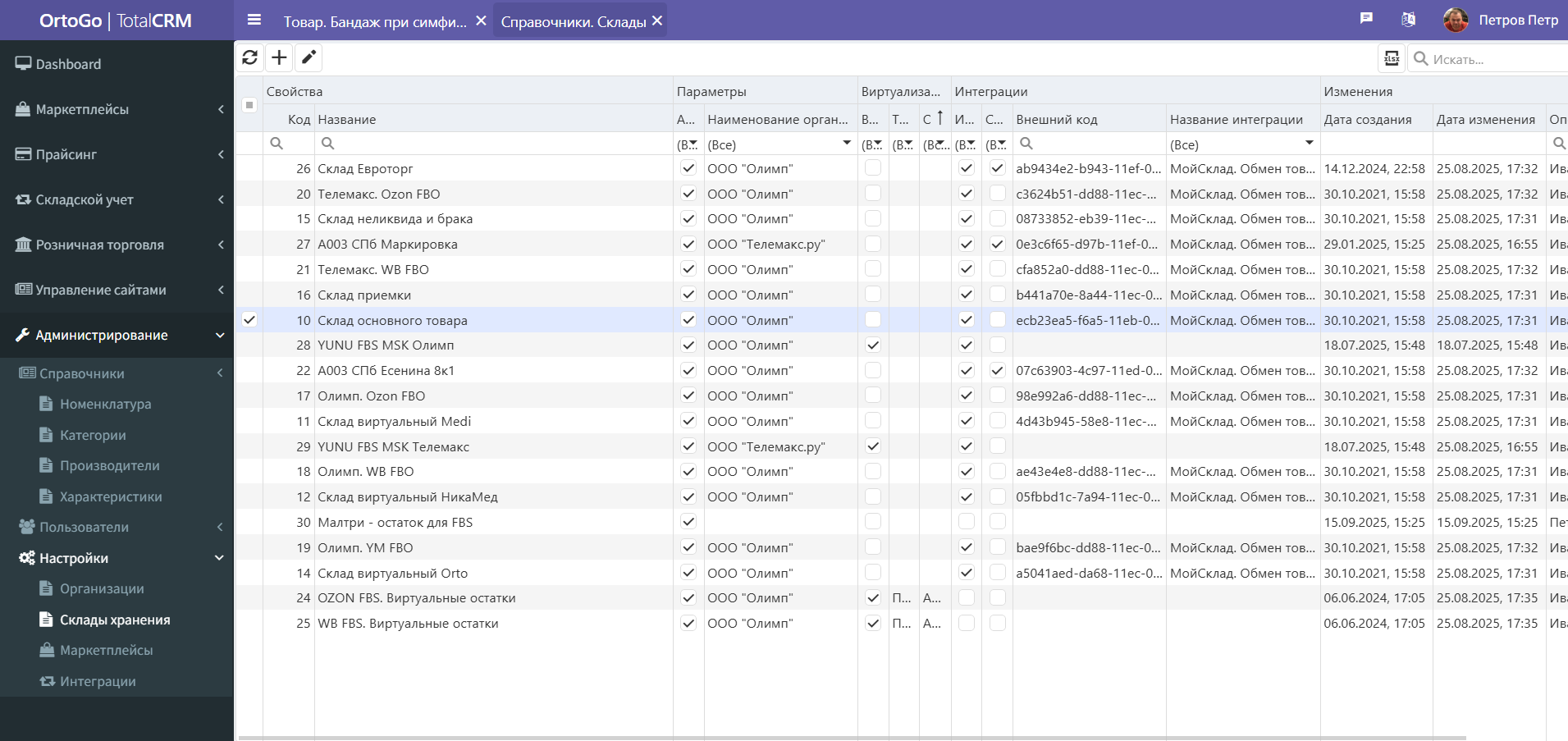 - Привязка к организациям: каждый склад может быть привязан к конкретной организации.