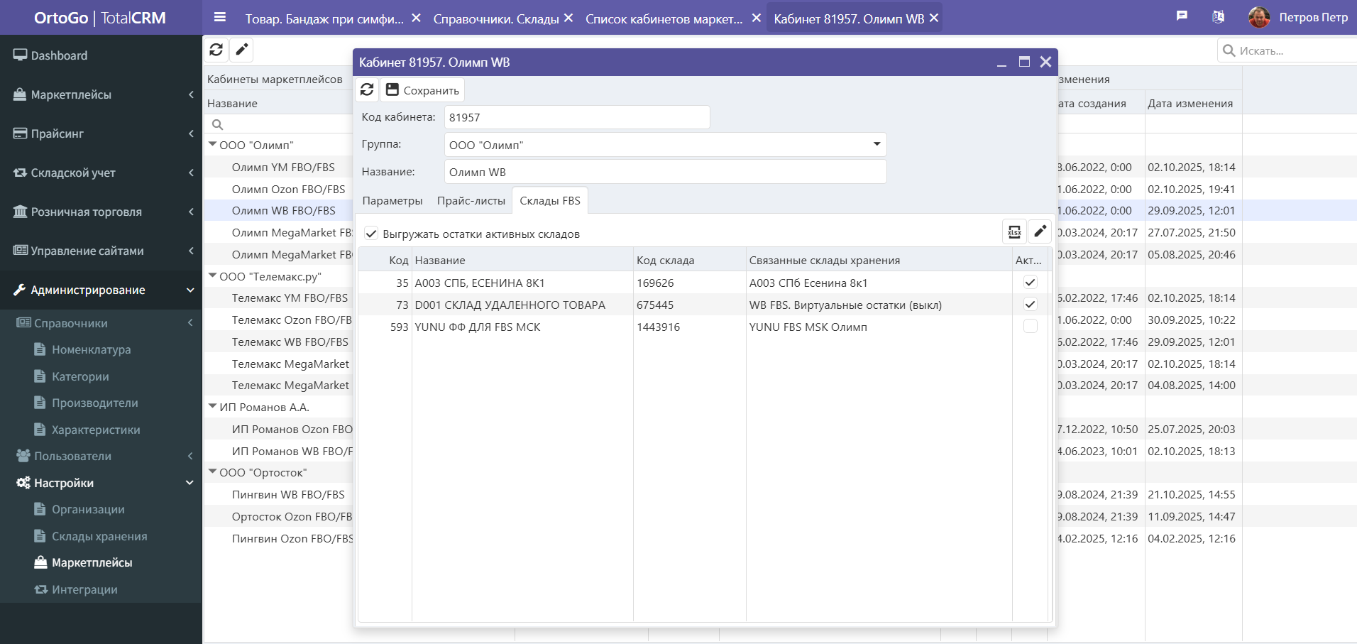 - Связь со складами маркетплейсов: склады в TotalCRM связываются со складами, указанными в кабинетах маркетплейсов.