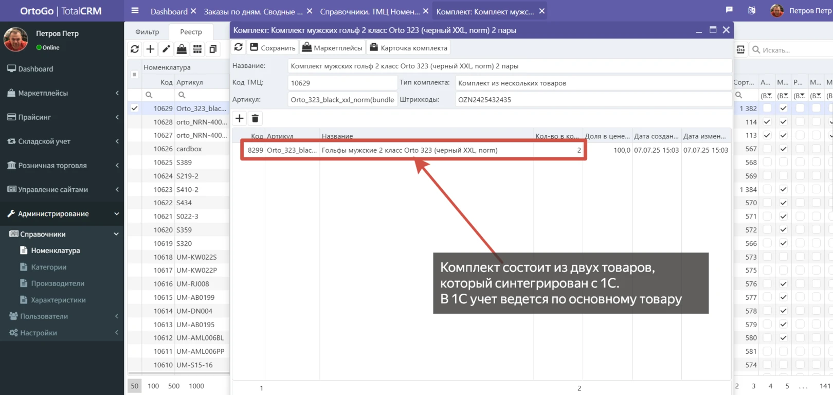 Реализация: функционал создания комплектов реализован внутри справочника номенклатуры TotalCRM и позволяет настраивать сложные товарные связки.