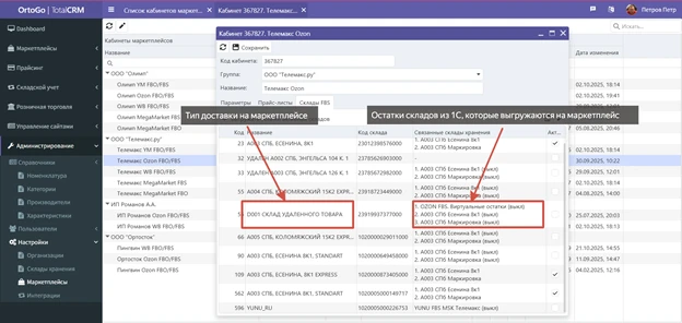 - Связь со складами маркетплейсов: склады в TotalCRM связываются со складами, указанными в кабинетах маркетплейсов.